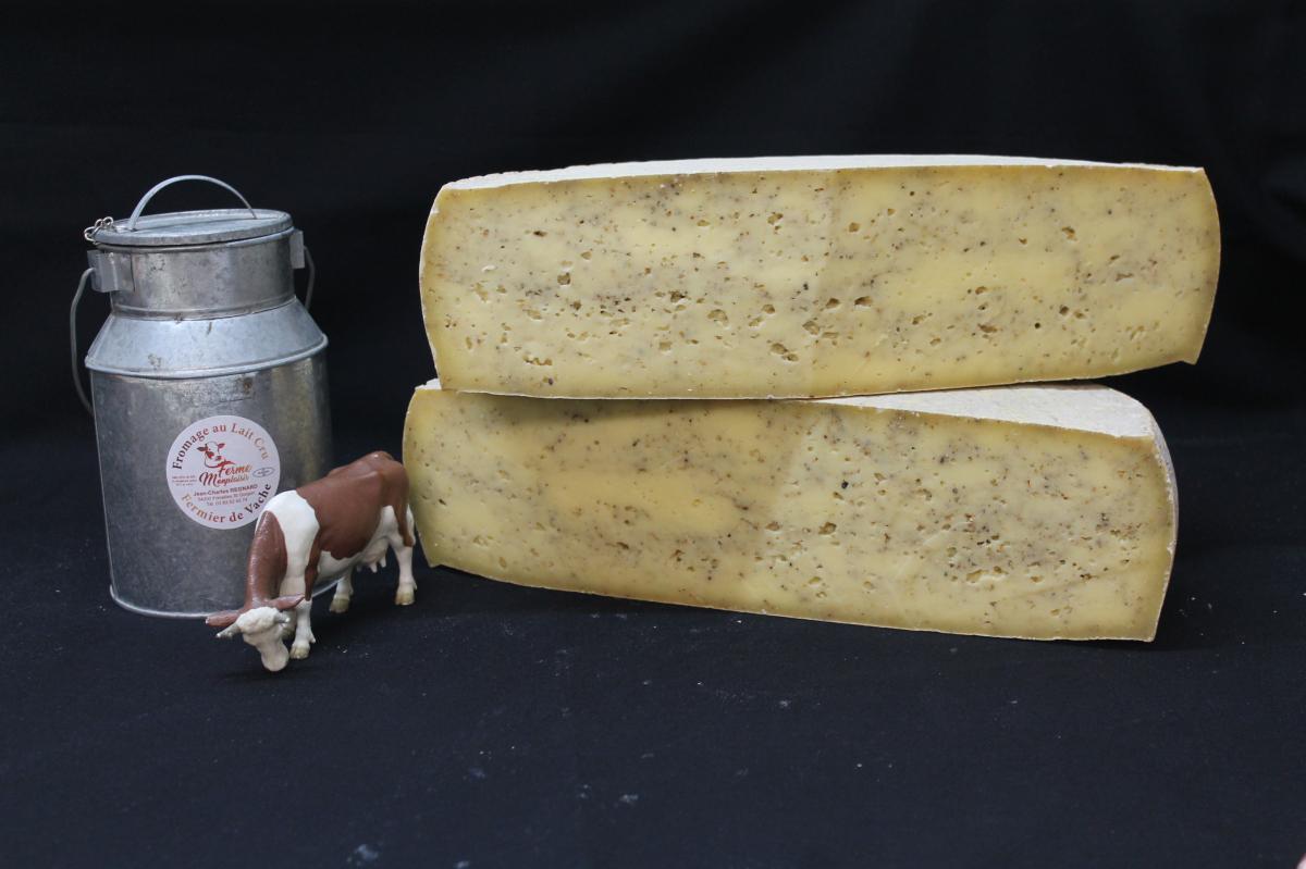 Tome du Saintois au lait cru de vache relevée par du curry noir torréfié, mélange d’épices typique du Sri Lanka : coriandre, cumin, poivre noir, nigelle, cardamome verte,